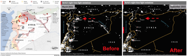 Aqui está um olhar um mapa mostrando onde Aleppo é em relação à base da Rússia em Latakia, junto com o antes e depois de imagens que destacou na semana passada que retratam as emissões de luz noturna no caminho para demonstrando claramente o efeito da guerra teve sobre a cidade.